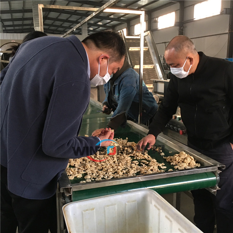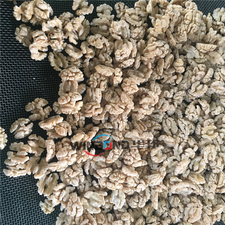 2.滾筒脫皮:采用高壓循環水泵可以快速、洗掉核桃仁表面的泥垢、表皮。清洗后進入清水噴淋區,然后進入振動篩,由振動篩將大部分水珠震動掉后進入風干線或烘干機,風干或烘干完畢后進入下一道工序。生產線可實現變頻調速、自動控溫,節水。
