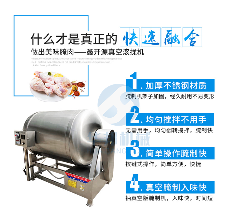 如果您還在為雞肉鴨肉腌制時間長發愁,如果您還在苦苦尋找快速腌制機,如果您想提高您的產品產量,那您就來華邦機械采購一臺適合您產量的真空滾揉機,采用呼吸式一呼一吸快速腌制的方法,通過對產品的摔打,滾揉,讓您的產品更細膩,腌制速度越快。