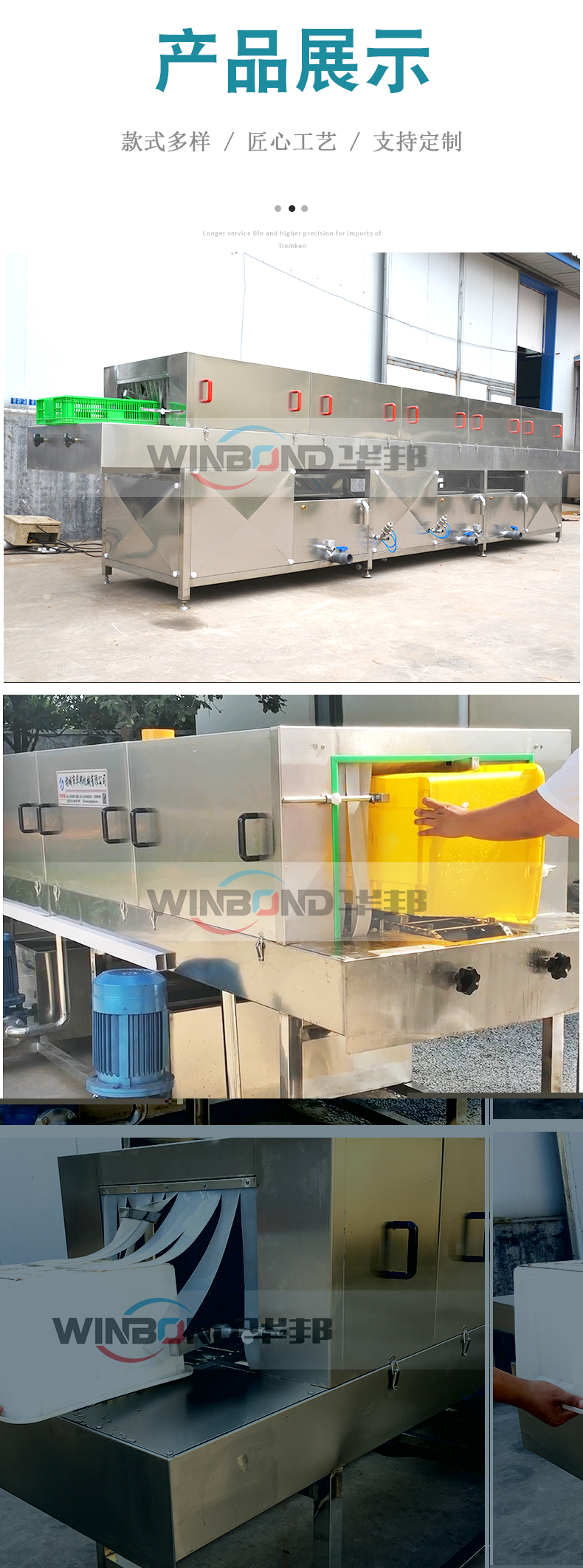 該產品主要有輸入、預洗、主清洗、漂洗及輸出部分組成。