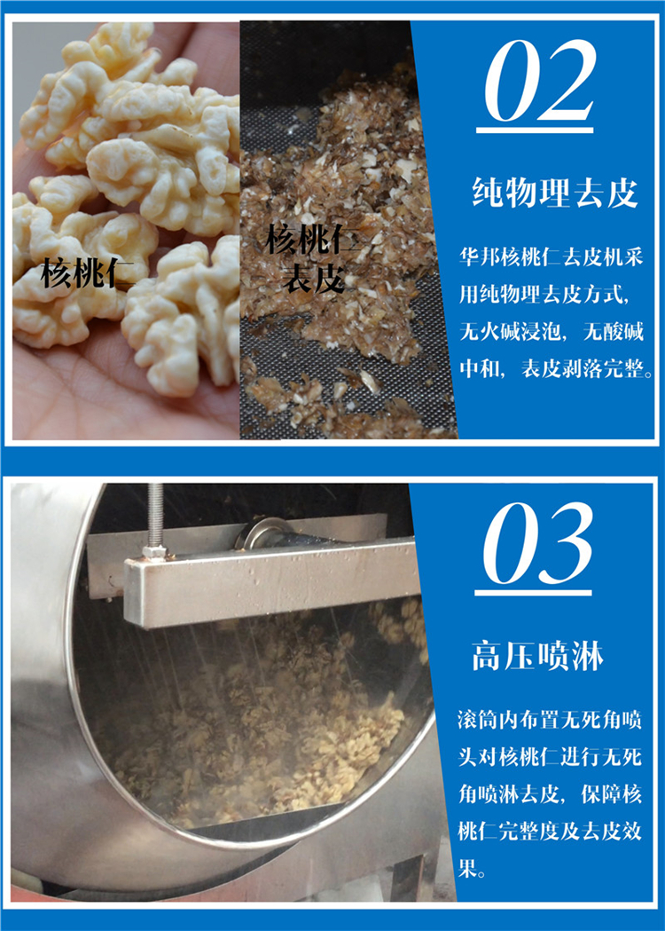 采用特殊設計的脫皮原理,脫皮過程中,核桃仁完全不經過刀片及硬度磨擦用,所以能確保加工物之完整性、新鮮度及無污染。