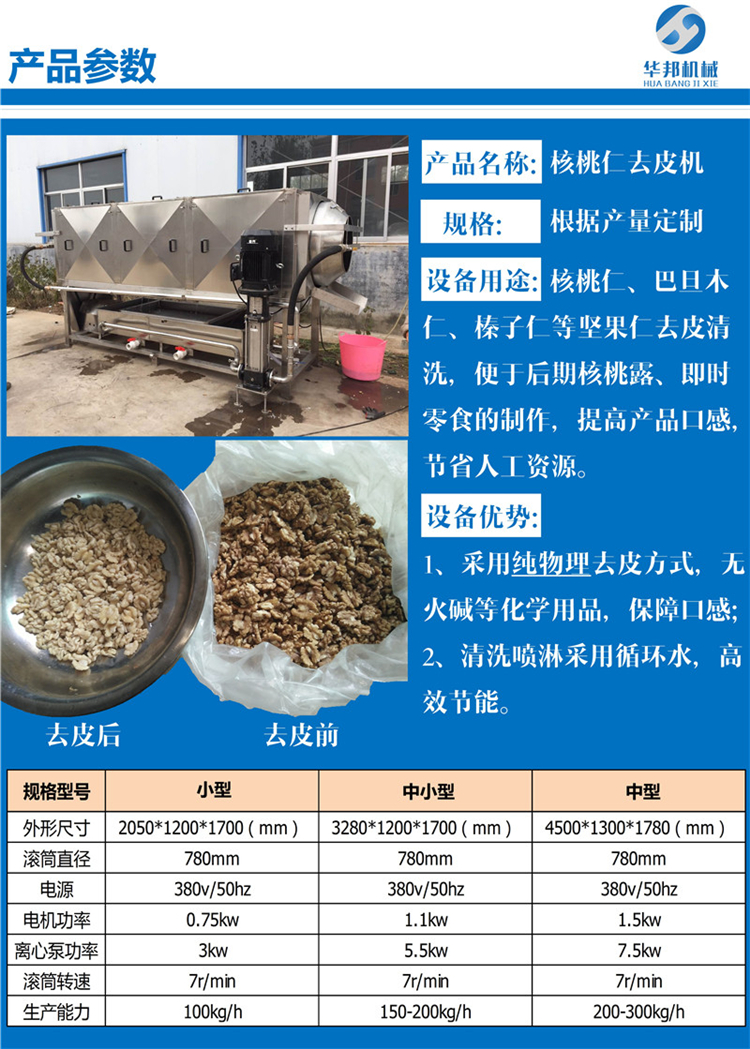 設有自動導料裝置,核桃仁皮自動分離,產品符合衛生標準,因核桃仁不易損傷故可提高質量!