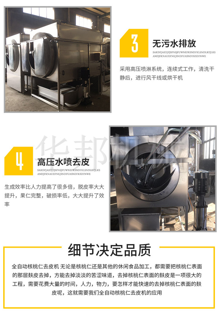 核桃仁的制作流程一般來說新鮮的核桃去掉青皮之后,再去掉硬殼,用水泡一下種仁,把種仁表面的一次淡黃色的內種皮去掉,得到的白色種仁再吃就沒有什么澀味了。不去內種皮的話,吃起來肯定會比較苦澀,影響口感。華邦機械新款核桃仁去皮機,采用滾筒式去皮,滾筒占地面積小,但是工作效率高,產量大。采用高壓噴淋清洗,能360度的將核桃仁的凹凸表皮去掉。直接采用自來水等清水去皮,不加藥水,色澤好,口感佳。脫皮時間短,12分鐘左右就可以完全脫掉,0破損,果仁完整。脫皮后的水可以直接排放,0污染