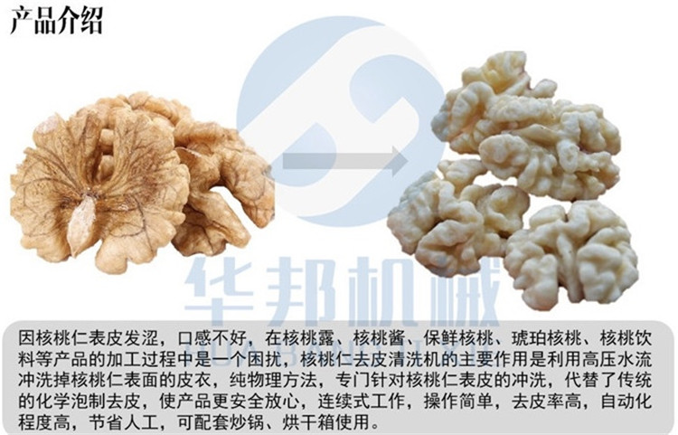 因為核桃仁表皮發澀,口感不好,在核桃露、核桃醬、保鮮核桃、琥珀核桃、核桃飲料等產品的加工過程中是一個困擾, 【一鍵撥號】咨詢,所以從很久以前,人們就開始手工沖洗浸泡過后的核桃仁,現在我公司生產出核桃仁清洗機,專門針對核桃仁表皮的沖洗,【一鍵撥號】連續式工作,操作簡單,去皮率高,自動化程度高,極省人工。